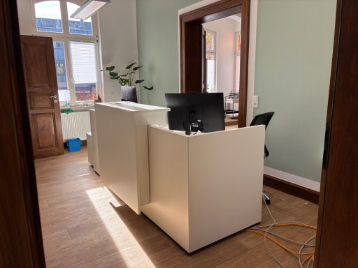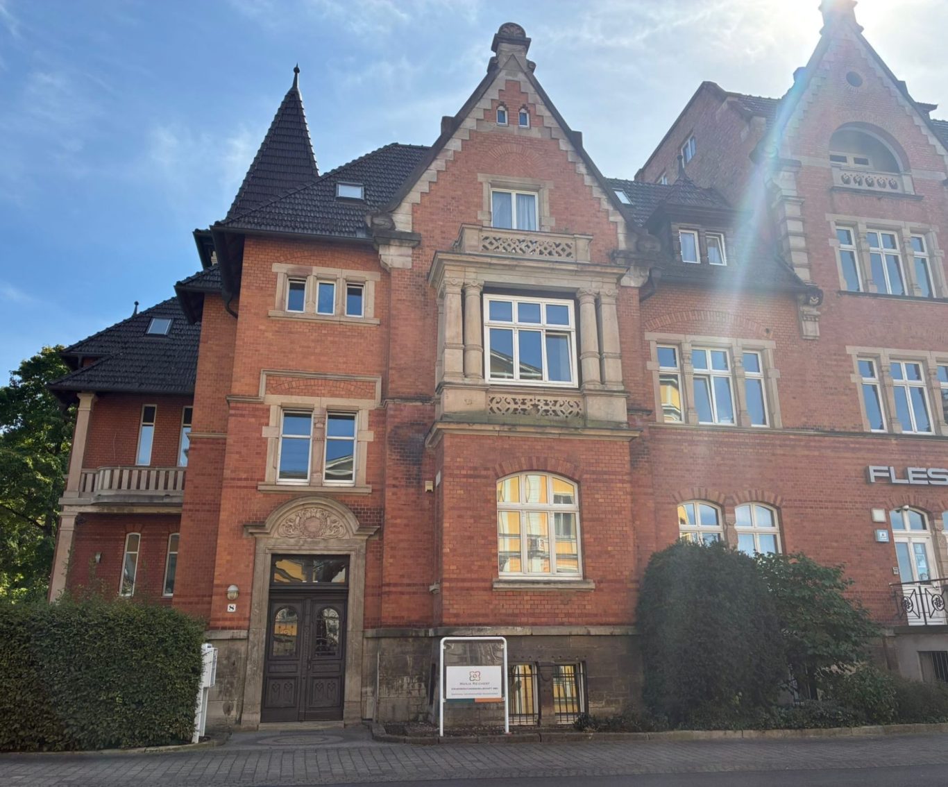 Wenn Sie vor dem roten Backsteingebäude, in dem sich auch die Flessabank befindet, stehen, sehen Sie links einen Eingang. Die Praxis befindet sich dort im 2. Obergeschoss über dem Steuerbüro Manja Reichert. Um die Tür zu öffnen, müssen Sie klingeln.